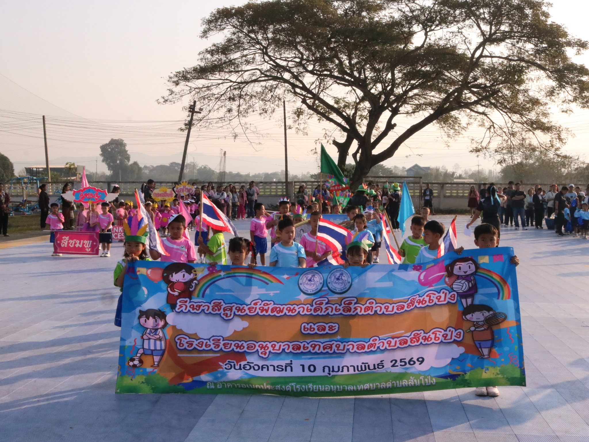 เทศบาลตำบลสันโป่ง ได้จัดกิจกรรมงานกีฬาสีศูนย์พัฒนาเด็กเล็กตำบลสันโป่งและโรงเรียนอนุบาลเทศบาล ในวันที่ 10 กุมภาพันธ์ 2569 ณ อาคารเอนกประสงค์ โรงเรียนอนุบาลเทศบาลตำบลสันโป่ง โดย พงศ์ชยรัช บัวบุญเลิศ นายกเทศมนตรีตำบลสันโป่ง เป็นประธานเปิดโครงการฯ โดยมีวัตถุประสงค์เพื่อมุ่งเน้นให้เด็กได้ร่วมกิจกรรมระหว่างกลุ่มเพื่อน, ครูผู้ดูแลเด็ก, และผู้ปกครอง เป็นการปลูกฝังให้เด็กมีคุณธรรมอันพึงประสงค์ รู้จักความมีน้ำใจเป็นนักกีฬา รู้แพ้ รู้ชนะ รู้อภัย ในการอยู่ร่วมกันในสังคมได้เป็นอย่างดีและมีความสุข รวมถึงเพื่อพัฒนาเด็กวัย 2 - 5 ปี ให้มีความพร้อมด้านร่างกาย อารมณ์ และสังคม อีกทั้งเป็นการกระชับความสัมพันธ์ของครอบครัวระหว่างโรงเรียนและชุมชน