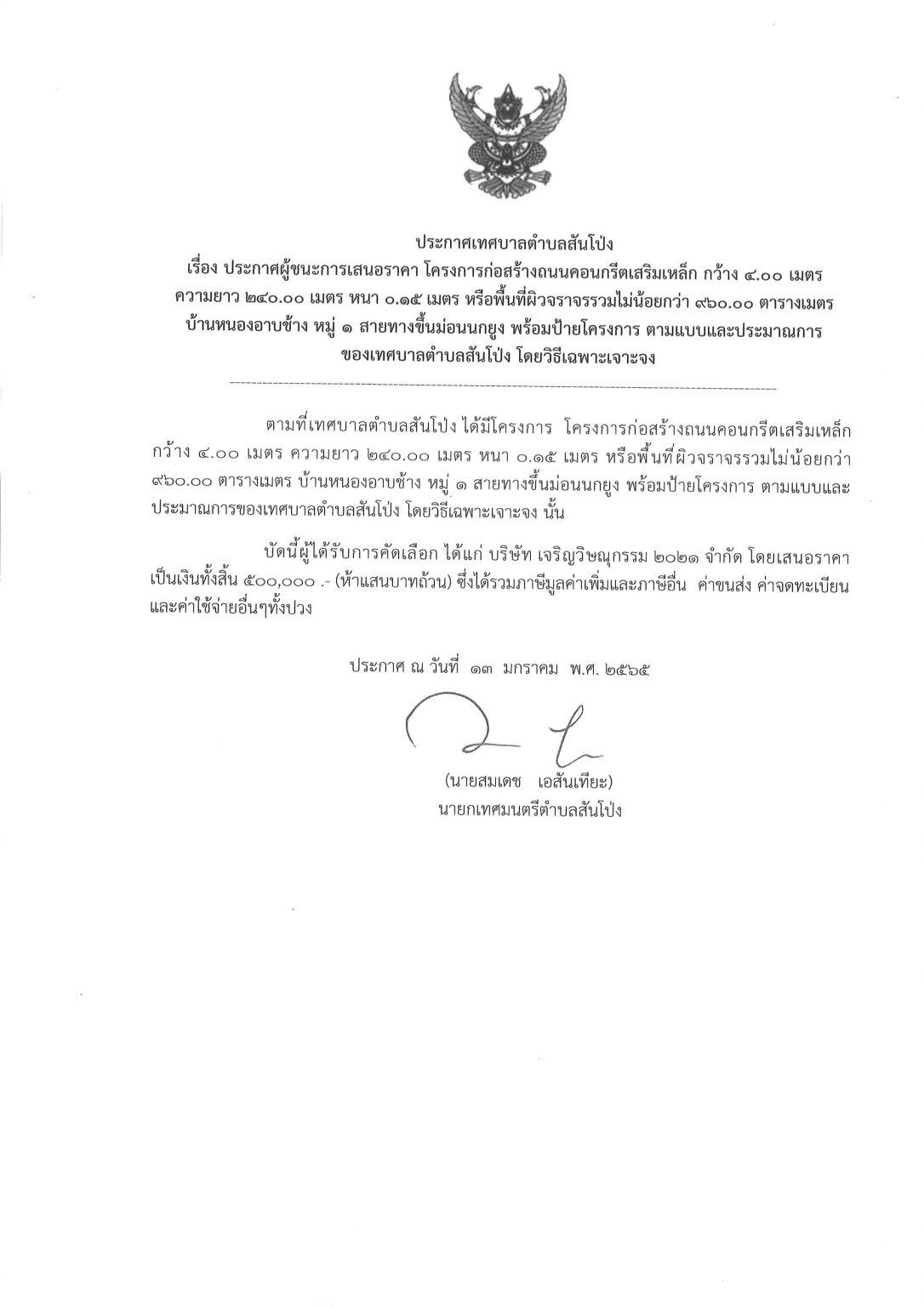 ประกาศผู้ชนะการเสนอราคาจ้างโครงการปรับปรุงผิวจราจรด้วยแอสฟัลท์ติกคอนกรีต บ้านดง หมู่ 5 ซอย3 (ซอยเจ้านาง) พร้อมป้ายโครงการ ตามแบบแปลนของเทศบาลตำบลสันโป่ง โดยวิธีเฉพาะเจาะจง