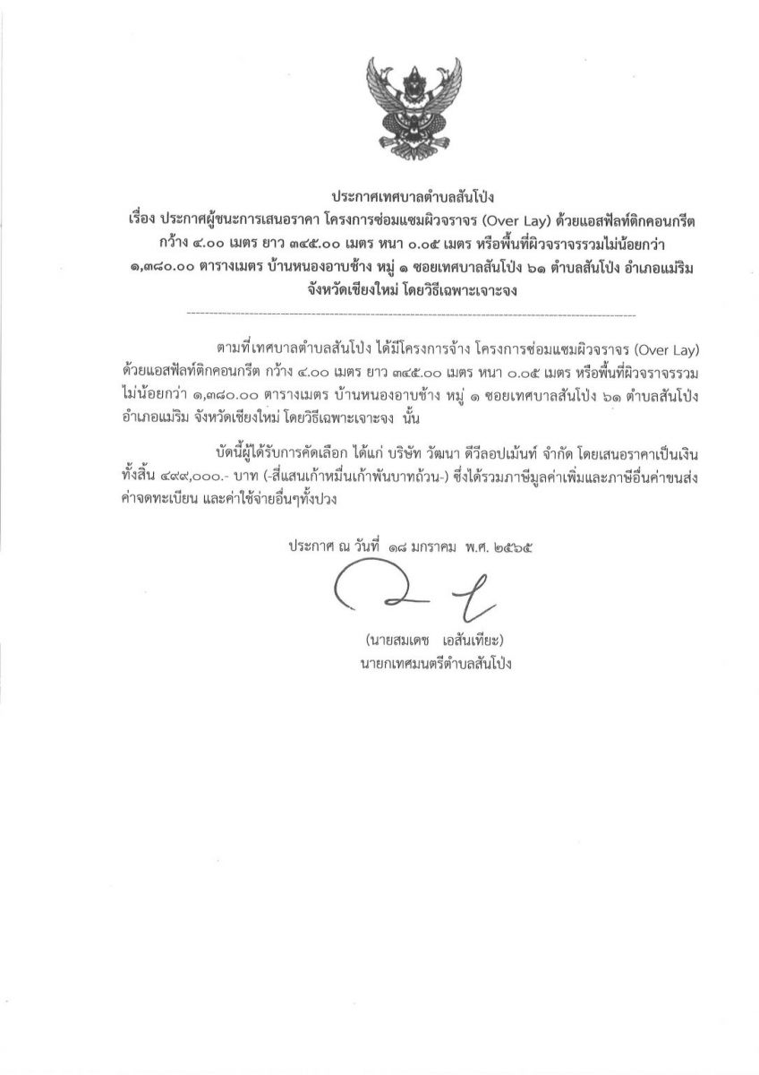ประกาศผู้ชนะการเสนอราคาจ้างโครงการซ่อมแซมผิวจราจร (Over Lay) ด้วยแอสฟัลท์ติกคอนกรีต บ้านหนองอาบช้าง หมู่ 1 ซอยเทศบาลสันโป่ง 61 ตำบลสันโป่ง อำเภอแม่ริม จังหวัดเชียงใหม่