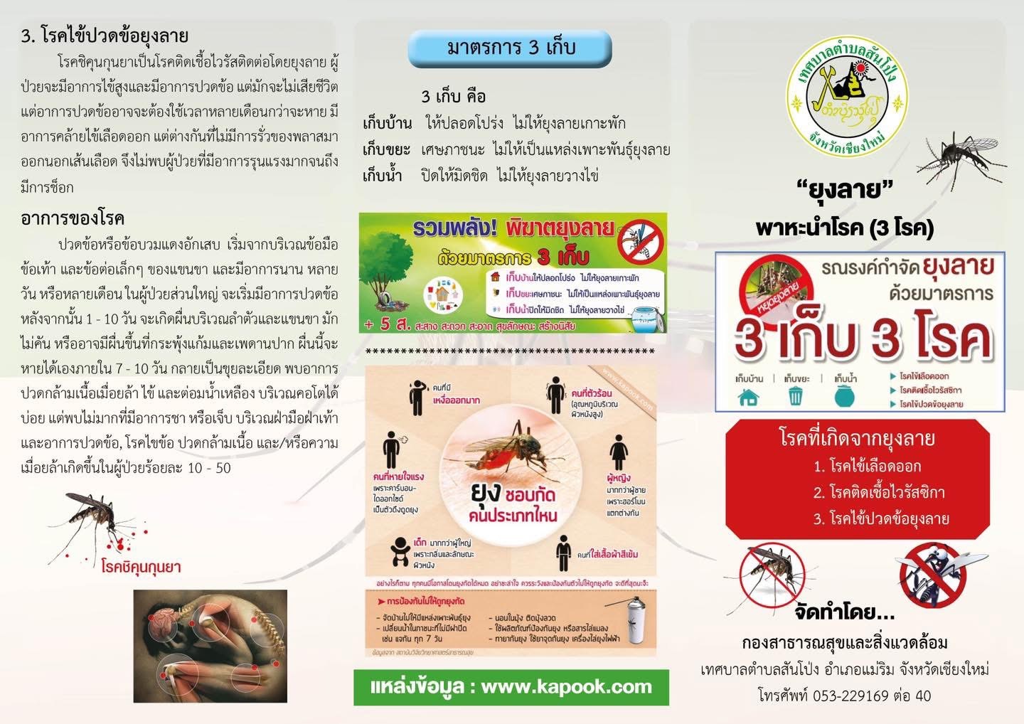 ทั้งนี้ ขอความร่วมมือให้ประชาชนในพื้นที่สำรวจแหล่งที่มีน้ำขัง และร่วมกันกำจัดแหล่งเพาะพันธุ์ยุงลายในบริเวณรอบๆ ตัวบ้านและในชุมชน โดยแนะนำให้ปฏิบัติตามมาตรการ “3 เก็บ ป้องกัน 3 โรค”