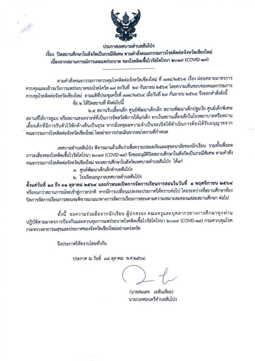 ประกาศเทศบาลตำบลสันโป่ง เรื่อง ปิดสถานศึกษาในสังกัดเป็นกรณีพิเศษ ตามคำสั่งคณะกรรมการโรคติดต่อจังหวัดเชียงใหม่เนื่องจากสถานการณ์การแพร่ระบาดของโรคติดเชื้อไวรัสโคโรนา 2019