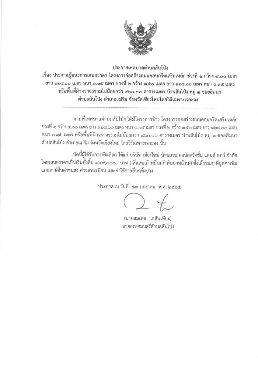 ประกาศผู้ชนะการเสนอโครงการก่อสร้างถนนคอนกรีตเสริมเหล็ก บ้านสันโป่ง ม.3 ซ.ฮิมนา ต.สันโป่ง อ.แม่ริม จ.เชียงใหม่