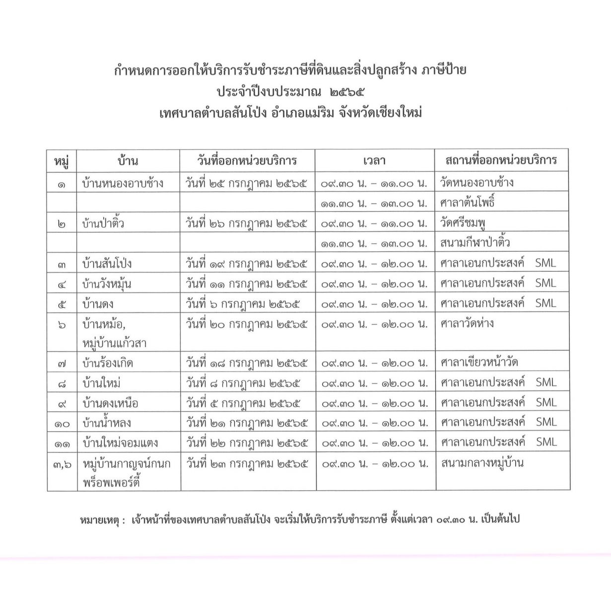 ประชาสัมพันธ์ งานพัฒนารายได้และจัดเก็บรายได้ กองคลัง เทศบาลตำบลสันโป่งขอแจ้งกำหนดการออกให้บริการรับชำระภาษีที่ดินและสิ่งปลูกสร้าง ภาษีป้าย ประจำปี พ.ศ.2565 ระหว่างวันที่ 5 – 26 กรกฏาคม 2565 ณ หมู่ที่ 1 – 11 ตำบลสันโป่ง (สถานที่หน่วยบริการตามกำหนดการเริ่มเวลา 09.30 น. เป็นต้นไป)