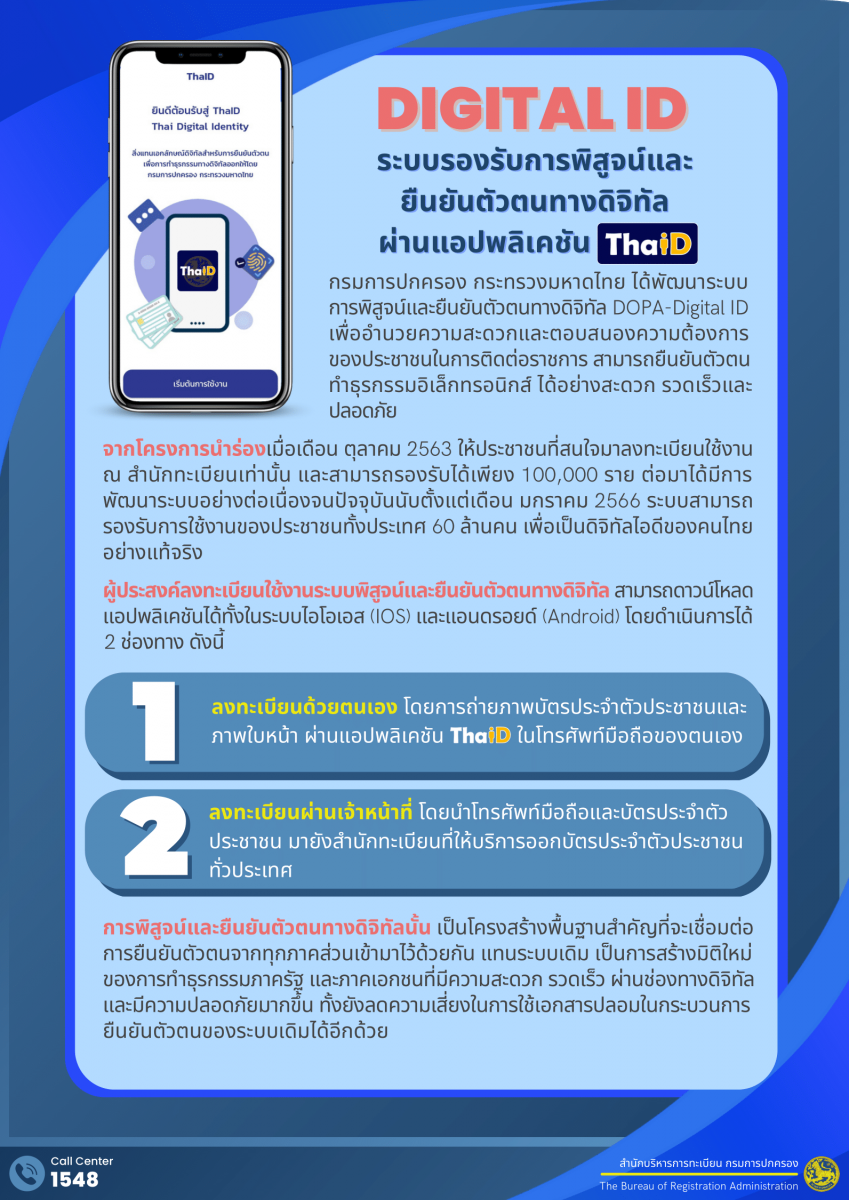 ดาวน์โหลดแอปพลิเคชัน ThaID ลงในโทรศัพท์มือถือของตนเองก่อนเข้ามาขอรับบริการลงทะเบียน ใช้ได้ทั้งระบบไอโอเอส (IOS) และระบบแอนด์ดรอย (Android)